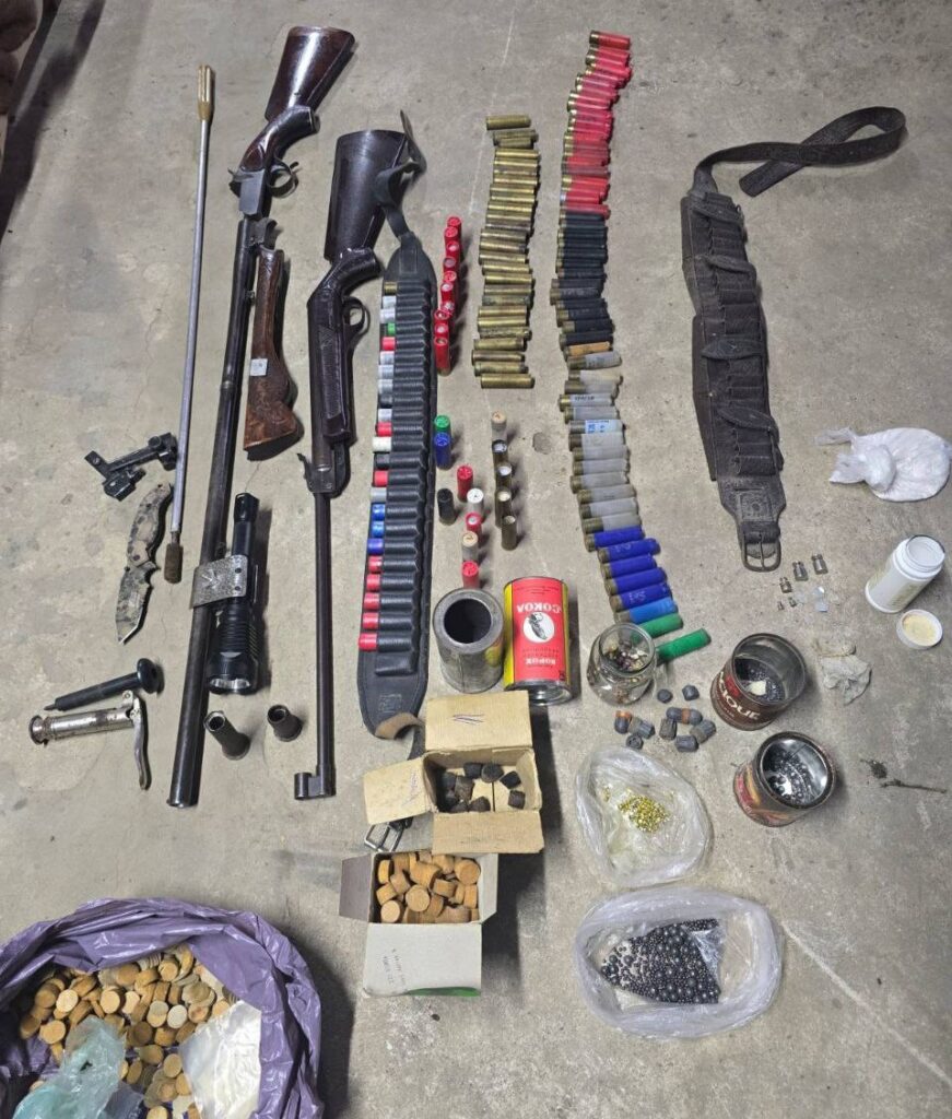 În locuință au fost depistate două arme (pneumatică și cu țeavă lisă), cartușe, tuburi de cartuș, precum și materiale pentru confecționarea muniției.